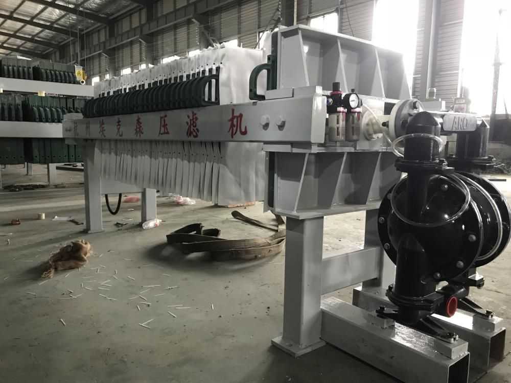 隔膜壓榨壓濾機是由隔膜板和廂式濾板排列組成濾室,在輸料泵的壓力作用下將料漿輸入濾室,通過過濾介質(濾布)將料漿中的固體和液體分離,當料漿中的固體形成餅后,再向隔膜通入空氣,對濾室內的固體充分壓榨。